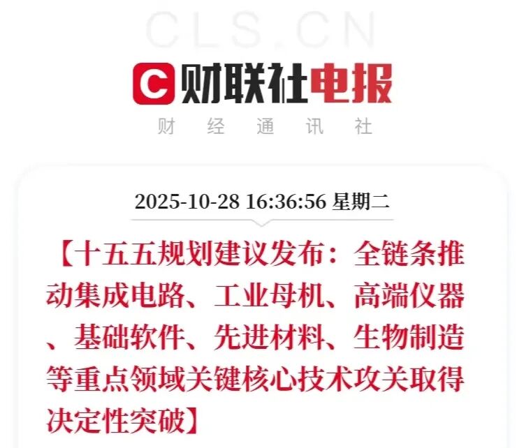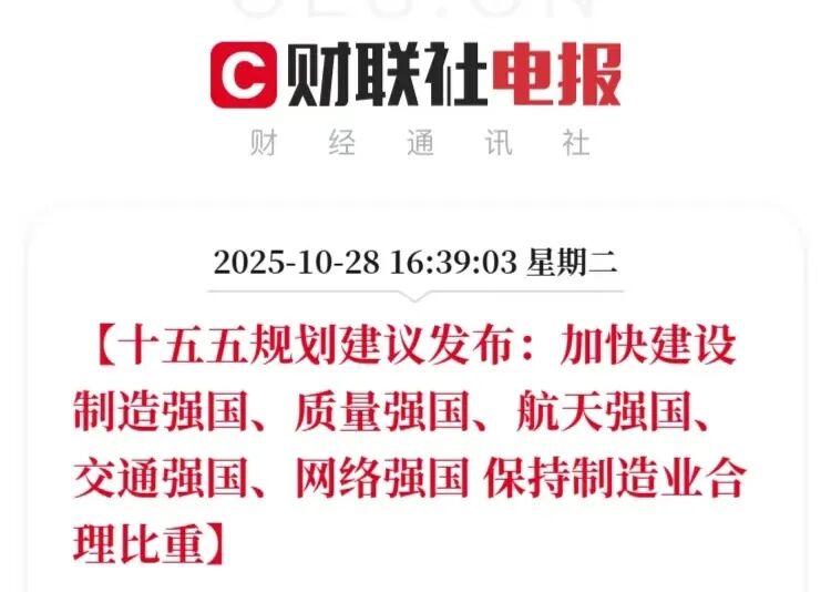 2025年10月28日,“十五五”规划建议发布,明确加快建设制造强国、航天强国、交通强国、网络强国,保持制造业合理比重,为我国产业升级与综合国力提升锚定方向。
