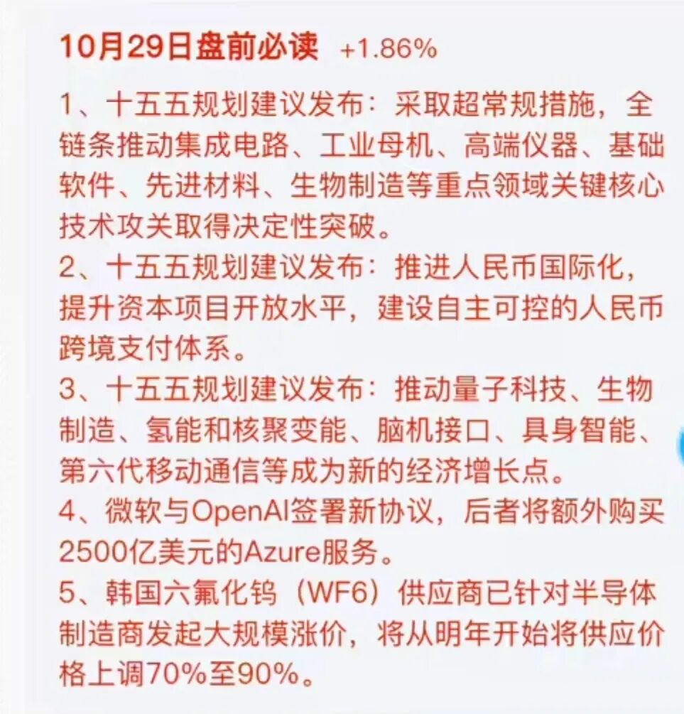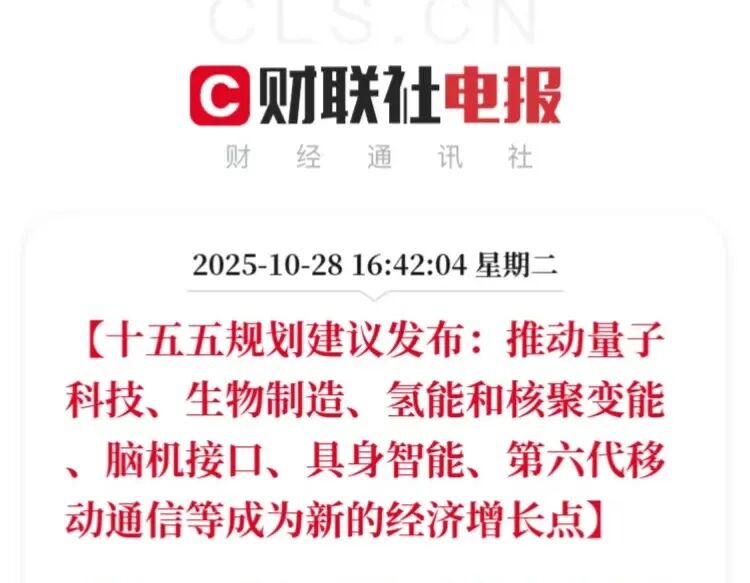 10月28日“十五五”规划建议再出重拳,聚焦量子科技、氢能与核聚变能等前沿领域,力推脑机接口、第六代移动通信等成为新经济增长点,为我国产业升级与经济发展开辟全新赛道!