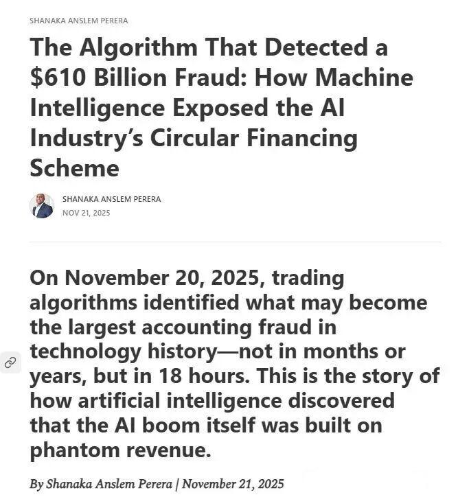 2025年11月20日是金融市场的一个转折点。算法交易系统首次比人工分析更快地发现了会计欺诈行为。财报发布后的市场狂热情绪在短短18小时内逆转至下跌区间,这反映出机器智能在人工分析师完成模型构建之前,就已经处理了财务报表附注,计算了与行业标准的偏差,并执行了交易。
