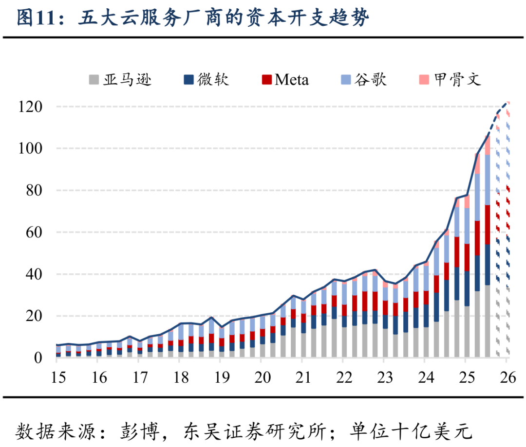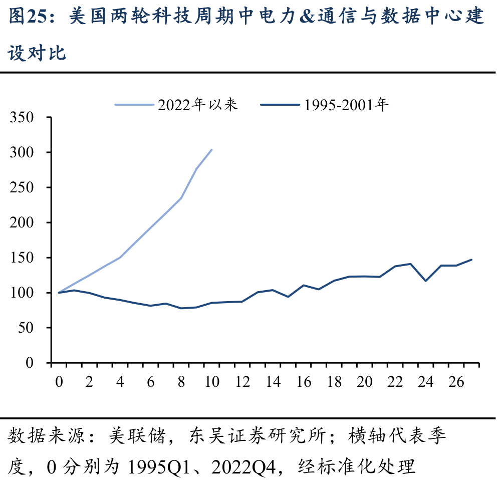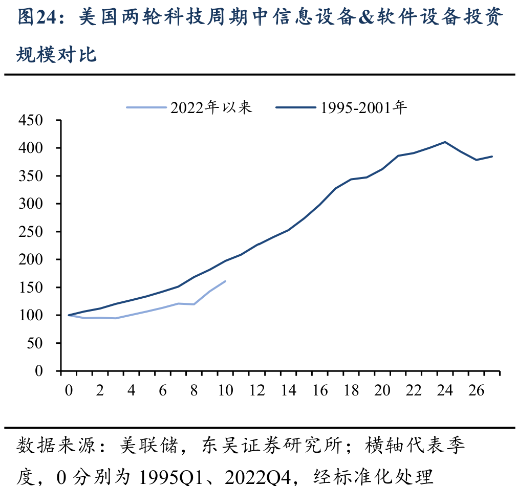 宏观层面上,推演AI产业投资周期的一个视角是对比过往的典型周期。对比1995-2000年互联网科技产业时期美国企业部门的固定资产投资可以发现,在设备投资上,企业设备投资规模的增长将持续近6年,而本轮AI产业周期中,美国企业部门沿着相似的路径,在设备投资规模上的扩张尚不足3年,仍在上升趋势的较早期。在建筑投资上,本轮AI产业革命与过往科技产业周期的一大不同之处在于,其对于数据中心建设、硬件设施、电力等建筑投资的需求空前高涨,迄今企业部门在建筑数据中心的投资已远远偏离上一轮周期中电力&通信设施建筑投资的增长。这一方面凸显了本轮AI科技浪潮对于固定资产投资和基础设施建设的巨大需求,另一方面也意味着,AI产业带动的美国企业部门投资仍有较大的空间。