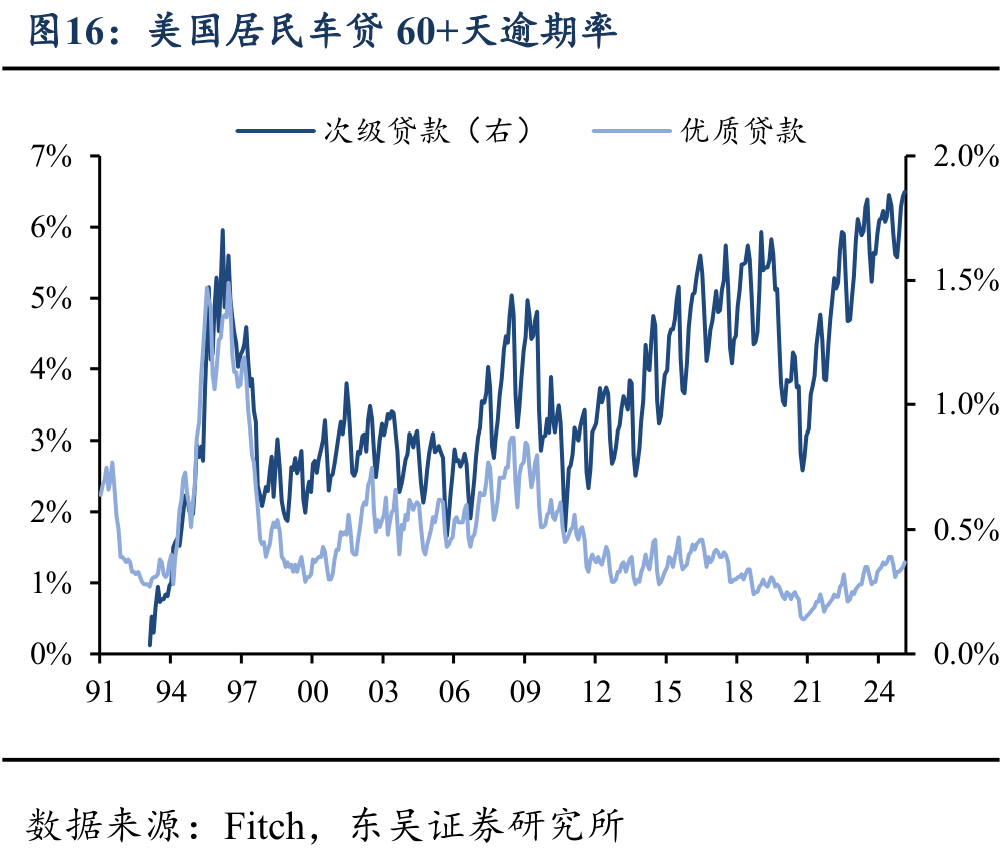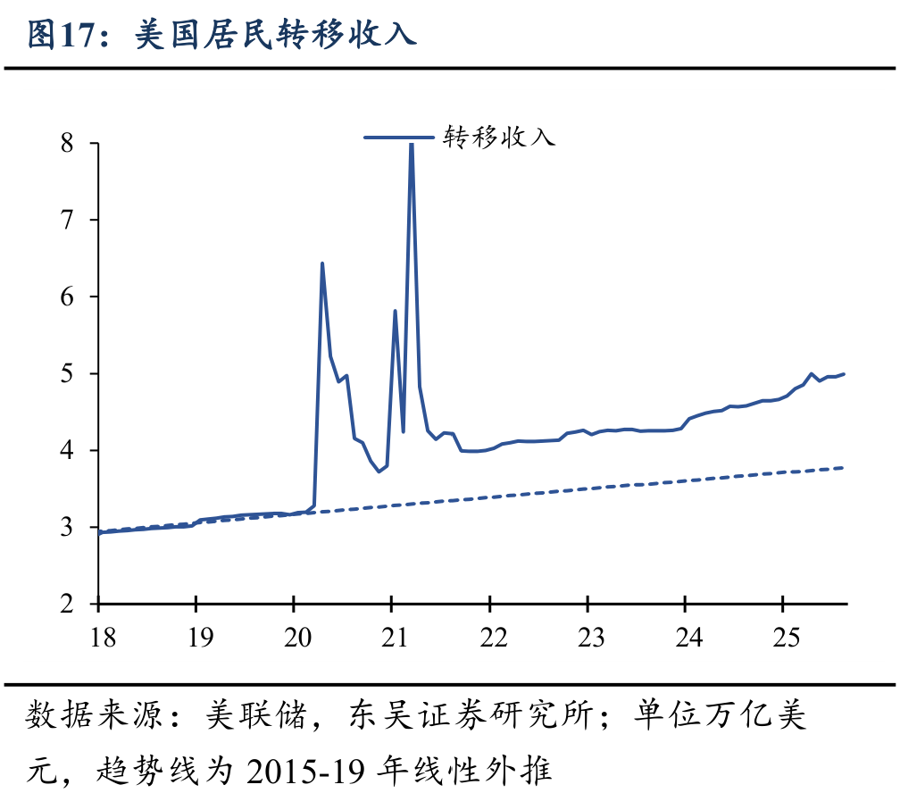 但需要注意的是,这种财富效应支撑下的“K型”消费模式面临增长放缓的压力。具体来看,随着就业市场的降温,今年以来美国中低收入群体的薪资增速已经从前两年的高位显著放缓、并低于中高收入群体;与此同时,股票资产在不同收入分位群体中的分布也存在类似现象:越来越多的股票集中于高收入群体中。这一现象意味着,今年以来美国消费的增长或更多来自于高收入阶层的贡献。表现在数据上,截至最新2025Q3,美国居民信用卡、车贷逾期率维持高位,其中次级贷款者、即中低收入群体违约是车贷飙升的主要因素。因此,向前看,考虑到今年以来美国的存量宽财政延续退坡、美国居民转移收入增长趋于停滞,若缺少增量的财政政策刺激,边际消费倾向更高的中低收入群体将面临更大的收支压力、进而拖累美国消费增长。这也表明2026年特朗普推行增量财政宽松具有客观必要性。
