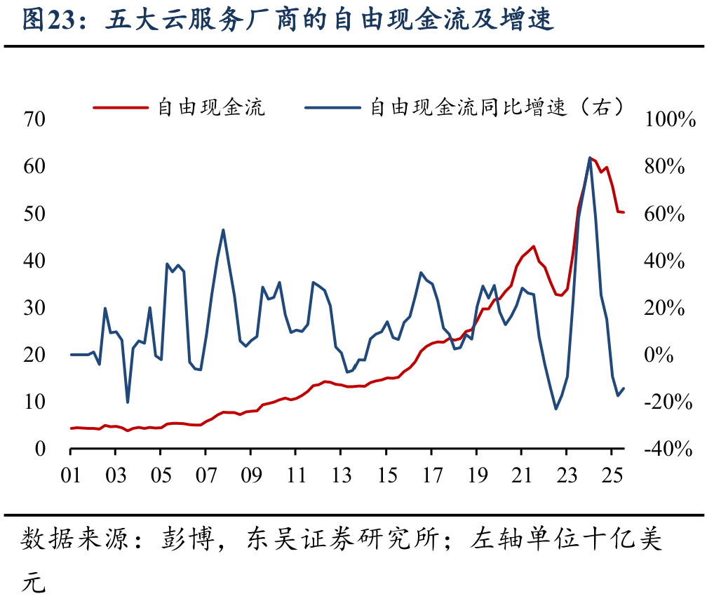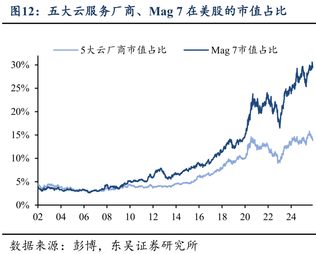 与当前AI引领的技术革命最为接近的案例当属1990s美国的互联网科技浪潮,因而市场也时常担忧同样基于相似软硬件基础的AI产业的迅猛发展,是否最终也将面临泡沫被刺破的风险?但正如Powell在10月FOMC发布会上对美股估值风险的评论,当前的AI产业与1990s科网泡沫最大的区别在于,如今科技巨头的股价上涨有真实的盈利基础,巨额资本开支有充裕的现金流作为支撑,而非严重依赖债务融资,因而发展模式较为健康。