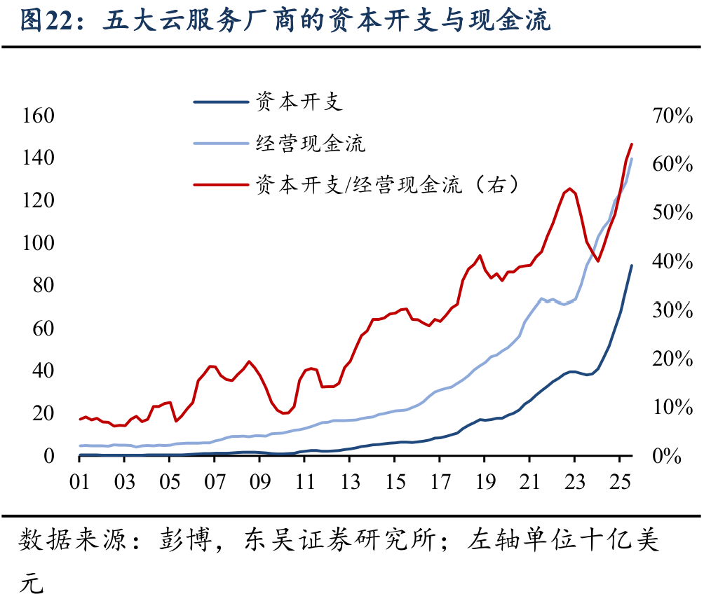 从代表性科技巨头的视角来看,上述资本开支的可持续性问题则显得相对突出。其中,五大超大型云服务厂商(hyperscalers,包括亚马逊、微软、谷歌、Meta、甲骨文)为代表的科技巨头的资本开支与经营现金流自2023年以来同步大幅上涨,而受资本开支更大幅度上涨的影响,其资本开支占经营现金流的比重在今年以来显著上行。因此,从自由现金流视角看,科技巨头的自由现金流规模在2023-2024年触顶后,已经转而向下。AI科技巨头现金流在近期的这一边际变化,及其债务融资的扩张,也成为市场对AI投融资可持续性问题担忧的主要来源。短期看,我们认为在前期积累的较为充裕的现金流与持续、稳健的盈利基础上,科技巨头的融资压力仍然相对可控,但同时,其内部较为分化:五大云服务厂商中规模小、业务更为单一的甲骨文公司近期则因融资问题担忧而引发公司CDS价格的上行。