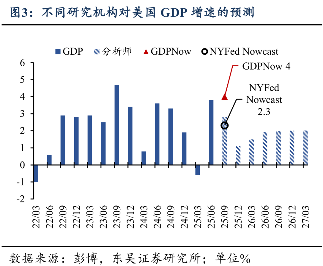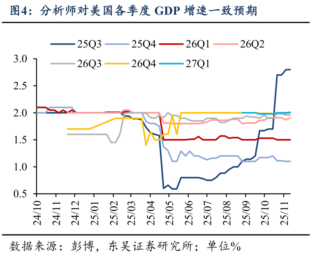 彭博10月问卷调查显示,当前分析师对25Q4-26Q4美国GDP季环比年率增速预期分别为1.1→1.5→1.9→2.0→2.0%。25Q4较低的增长预期主要来自长达43天的政府停摆对经济的拖累。根据CBO测算,长达六周的停摆将给25Q4美国GDP带来1.5%的拖累,但随着政府停摆结束,政府雇员工资发放、政府支出恢复等将给26Q1美国GDP带来2.2%的提振。但总体上,我们预期25Q4-26Q2美国经济延续软着陆趋势,经济的改善预期将始于26Q3,届时美国的货币与财政政策都将开始变得宽松。