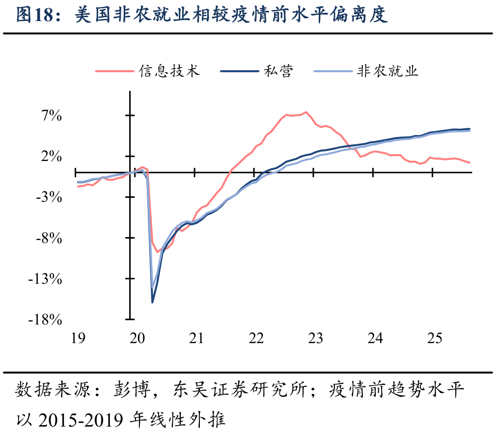 非农就业方面,AI产业发展及其泡沫化过程对美国就业的直接冲击主要在两个方面:①AI的应用对中低端就业人员的替代;②AI走向泡沫化,科技巨头因后续盈利增长乏力或融资压力而裁员。对于前者,现有研究并未给出一致结论,而在当前周期中,美国就业增长的放缓存在普遍性和周期性特征,而非AI带来的结构性失业;对于后者,25Q3财报季期间,亚马逊等科技巨头的裁员消息也加剧这一担忧。但从信息技术行业就业人员变化来看,现阶段美国的科技裁员部分来自疫情期间扩招的影响,并且科技相关行业就业占比并不大,因此影响程度可控。