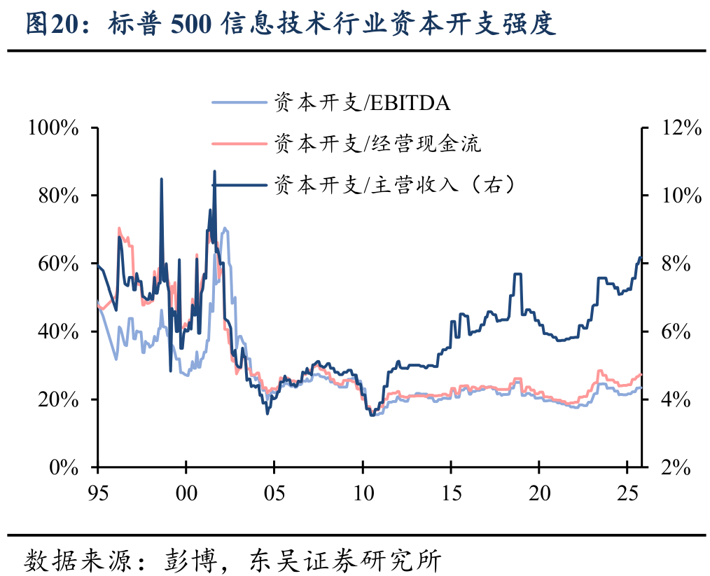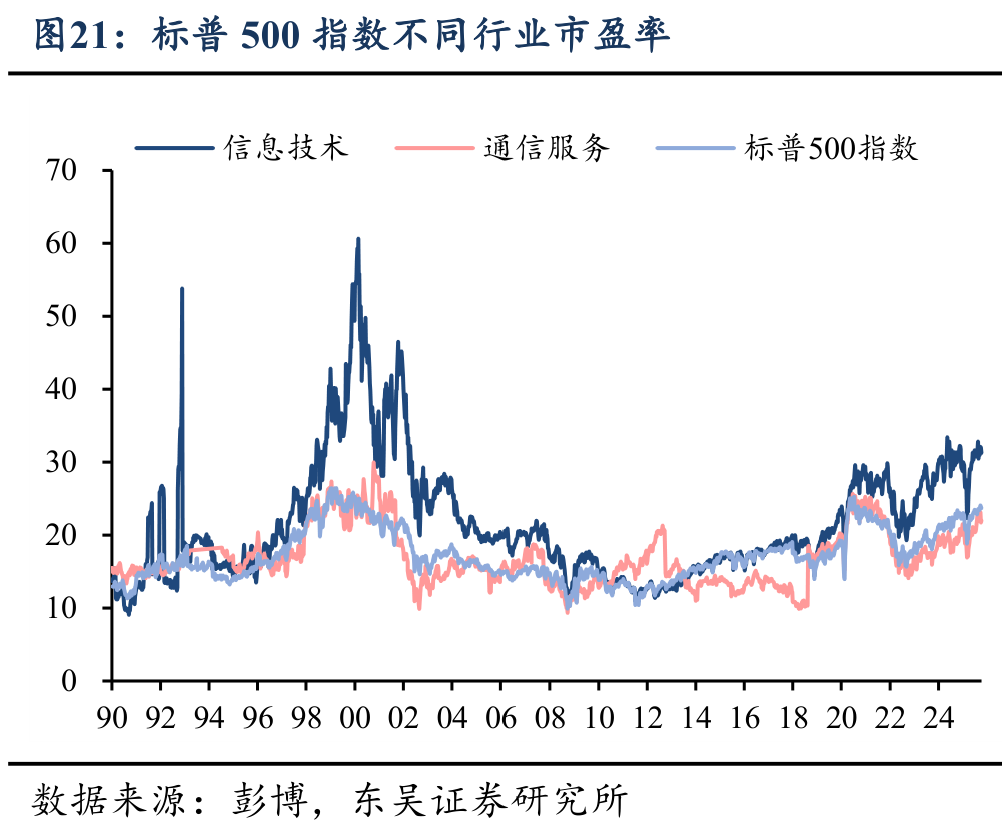 行业层面上,从资本开支强度来看,在不同衡量口径下,美股信息技术行业的资本开支自2022年以来显著上升,其中资本开支与营收之比上涨速度较快,目前已超过疫情前水平;资本开支与利润、经营现金流之比虽然也呈现小幅上行,但仍处于20-30%的较低水平,与长周期内的平均水平差距不大。特别地,无论以何种口径衡量的资本开支水平,上述指标相较1995-2000年期间的历史高位仍有一定的距离,尤其是在利润和现金流视角下,美股科技行业的资本开支仍有较为充足的现金“缓冲垫”。从估值水平来看,尽管当前标普500指数的估值水平已接近1998年左右的高位,但信息技术行业的估值水平与2000年飙升的峰值相比,仍然并不极端。