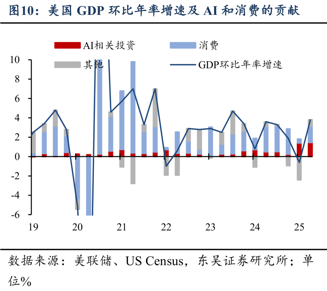 具体来看,我们将美国GDP增速拆分为AI相关投资、消费及其他。其中AI相关投资包括数据中心建筑、计算机及周边设备、软件三项。由于BEA目前只披露了年度的数据中心建设数据,我们参考US Census公布的月度数据中心建设名义值,在GDP口径下进行简单处理,对这一项目的季度数据进行估算。如图10所示,可以发现,尽管占比较小,但环比增速的飙升使得AI相关投资在2025上半年平均拉动美国GDP环比增长1.4%,超越私人消费平均1.05%的水平。在美国消费增速趋于放缓的当下,这对美国增长前景具有重要意义。
