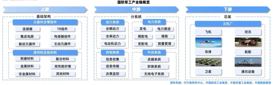 产业链覆盖从基础原材料到最终装备的全流程,核心环节包括军工材料、元器件、功能组件和模块、微系统以及军工电子装备。