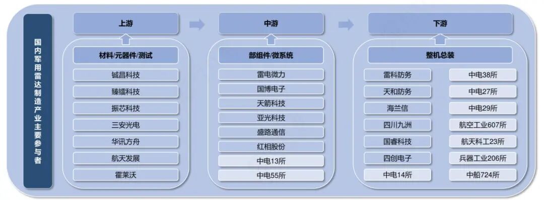 组件与模块:包括微波组件、计算机组件、通信组件等,需具备系统集成和算法研发能力。例如,雷电微力在相控阵微系统领域领先,国博电子为TR组件核心供应商。