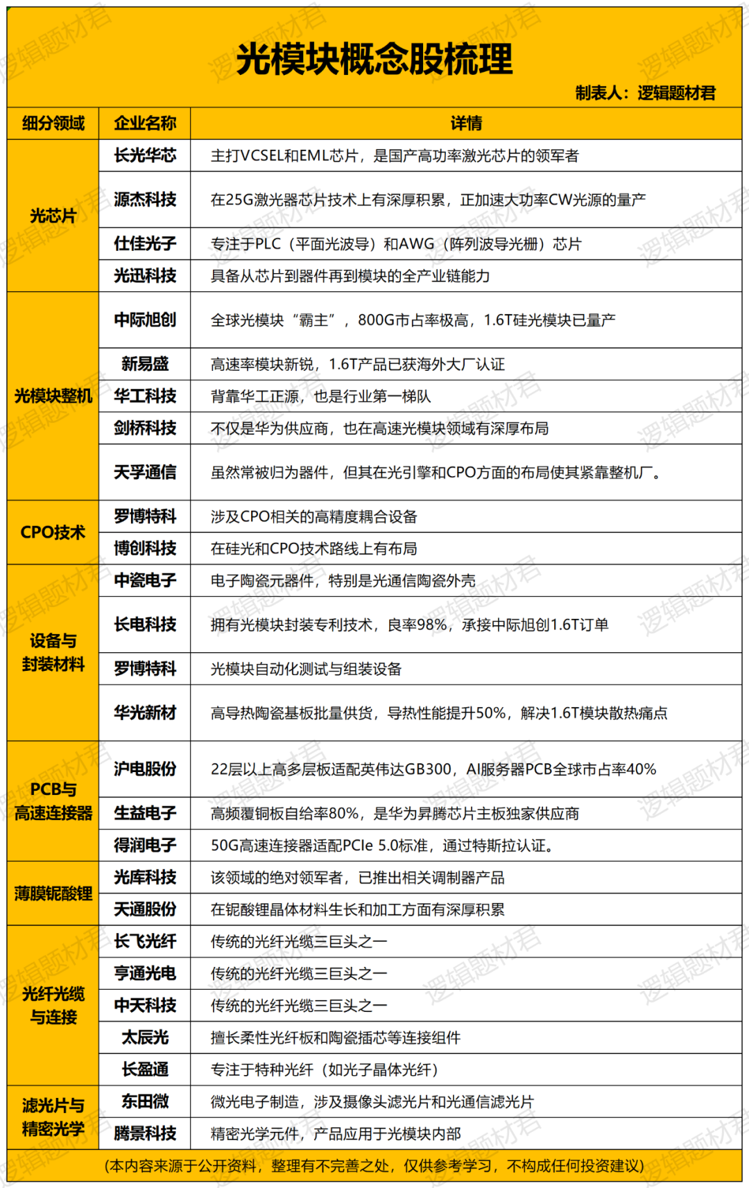 题材君接下来帮大家梳理一下光模块相关概念股,并筛选其中最核心8家企业,以便大家供大家研究参考,以便后期跟踪