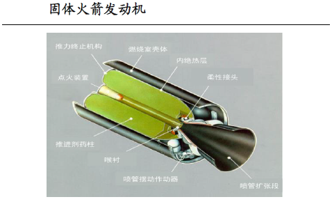 在固体火箭发动机中,燃烧用的推进剂经压伸或浇注制成所需形状的装药,直接装于燃烧室或发动机壳体内。工作时,由点火装置点燃点火药,进一步将装药迅速加热点燃,使推进剂的化学能转变成燃烧产物的热能,继而膨胀加速后高速排出产生推力。