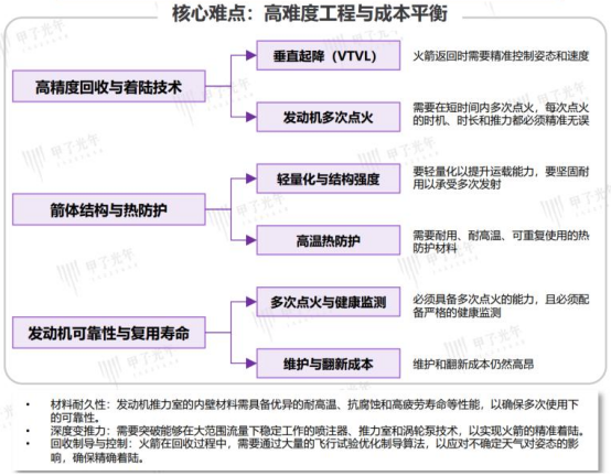 可重复使用火箭的革命性意义在于通过显著降低发射成本、缩短任务周期,从而大幅提升运力供给,其中低成本是推动航天产业实现“商业化”的核心驱动力。卫星互联网的规模化部署将显著提速,并催生太空旅游、在轨制造、深空探测等新兴商业场景。可回收技术的挑战在于如何协调工程复杂性与经济性之间的矛盾。当前核心难点在于,在确保火箭可靠和安全回收的基础上,同时平衡高难度工程技术(如高精度制导、热防护和发动机多次点火)的研发和实施成本,以最终实现整体发射成本的有效降低。