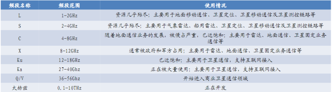 通信的无线频段包括L、S、C、X、Ku、Ka、Q、V等各个波段,L、S频段主要用于卫星移动通信;C、L频段主要用于卫星固定业务通信,Ka频段应用开始大量出现。为了满足日益增加的频率轨道资源需求,卫星通信频道正在布局Q/V等更高的频段资源。