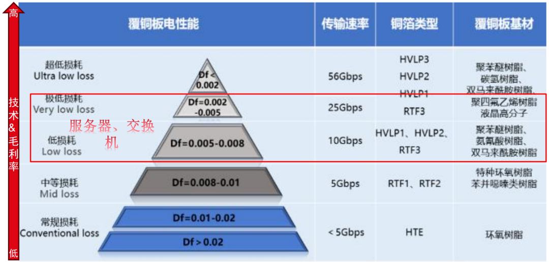 不同厂商给树脂起的名字不一样,但目前行业里大多用松下的树脂分级体系来划分类型,等级越高,传输信号时的损耗就越小。