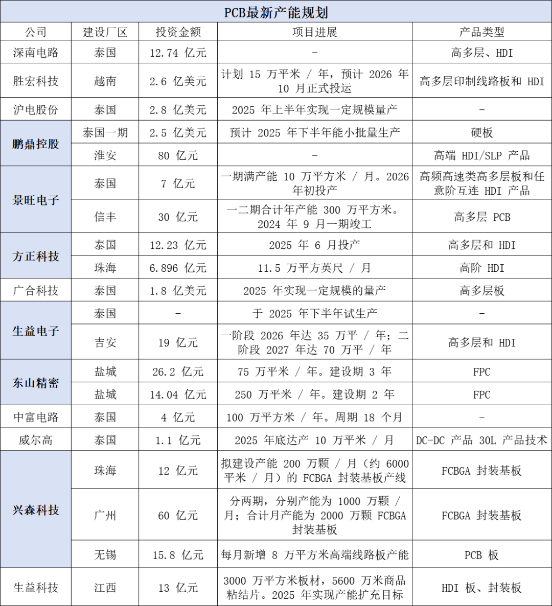 国内PCB厂商深南电路、胜宏科技、鹏鼎控股等,正在东南亚(泰国、越南)及国内加码建厂,产品涵盖高多层板、HDI、FPC、FCBGA 等,产能扩充显著。