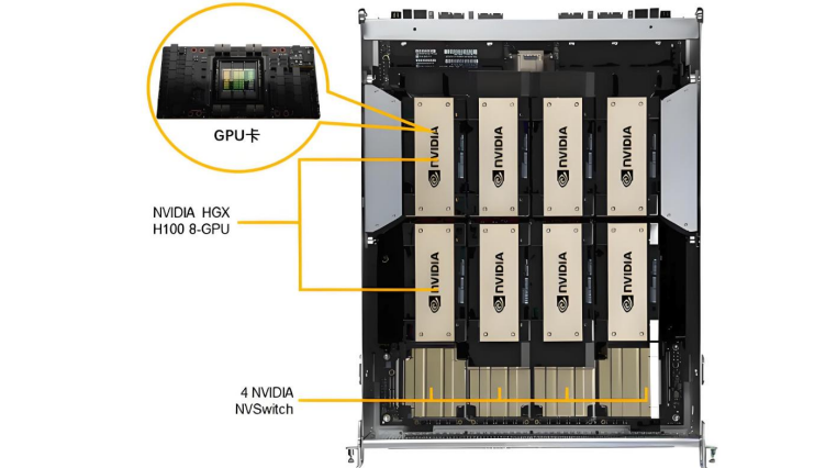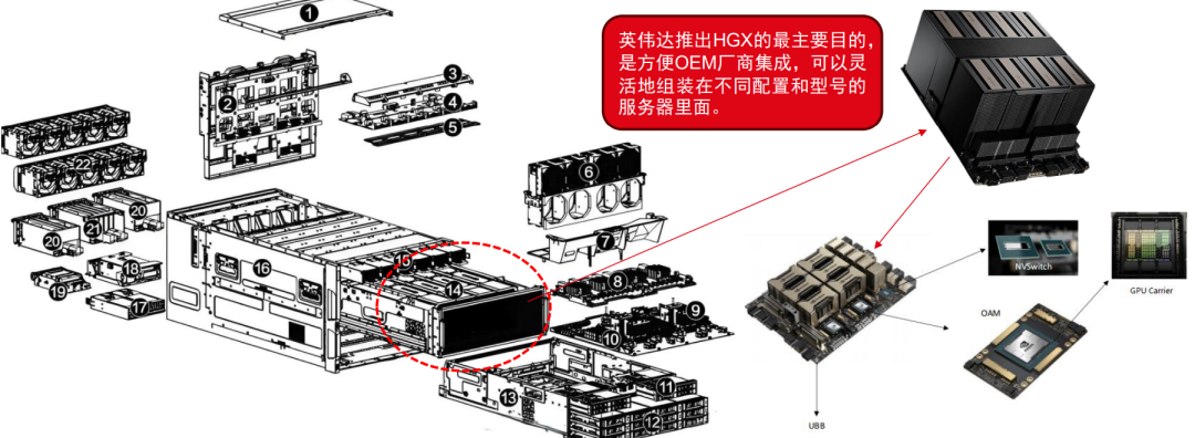 SXM机型在英伟达服务器里面,通常通过SXM模组来把GPU芯片集成在一起,里面包含了GPU芯片、显存、NVSwitch、电源接口、风扇等。