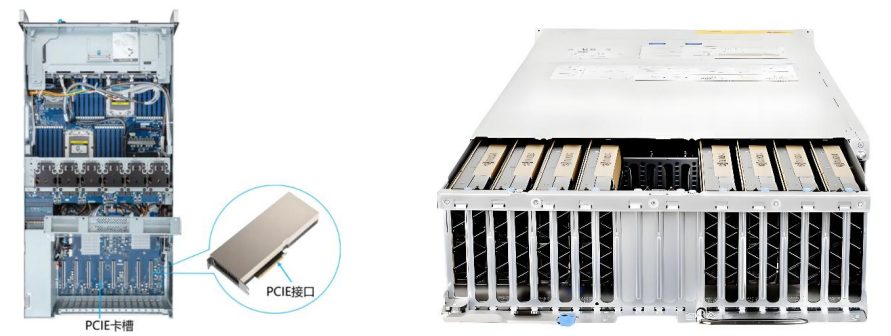 通过服务器上的PCIe卡槽来安装GPU卡的,GPU卡与GPU卡之间通过PCIE总线互连,是一种内部总线,也是一种计算机扩展总线标准,是一种高速串行、高带宽扩展总线,通常用于主板上连接显卡、固态硬盘、各类采集卡和无线网卡等外设。PCIe不仅限用于主板上,在很多芯片与芯片之间的互连也采用的是PCIe的总线。
