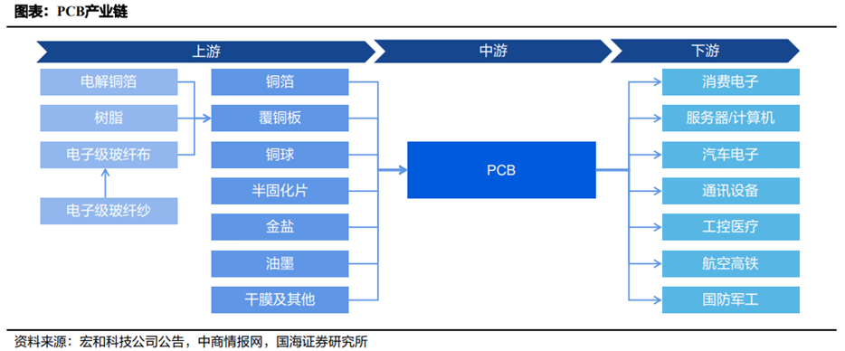 PCB行业上游为铜箔、电子级玻纤布、树脂、油墨、覆铜板等原材料行业,中游为PCB的生产制造行业,下游广泛应用于通讯、网络、计算机、服务器等领域。电子纱行业、电子布行业、覆铜板行业、PCB行业属于产业链上紧密相连、相互依存的上下游基础材料行业。