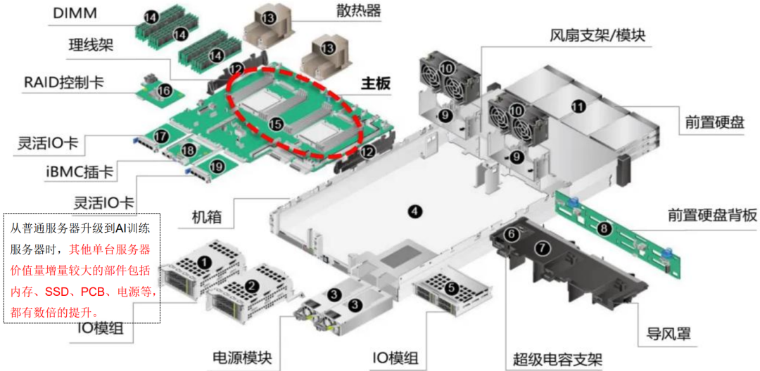从普通服务器升级到AI训练服务器时,内存、SSD、PCB、电源等部件价值量实现数倍提升,背后是AI训练对硬件性能的极致需求驱动: