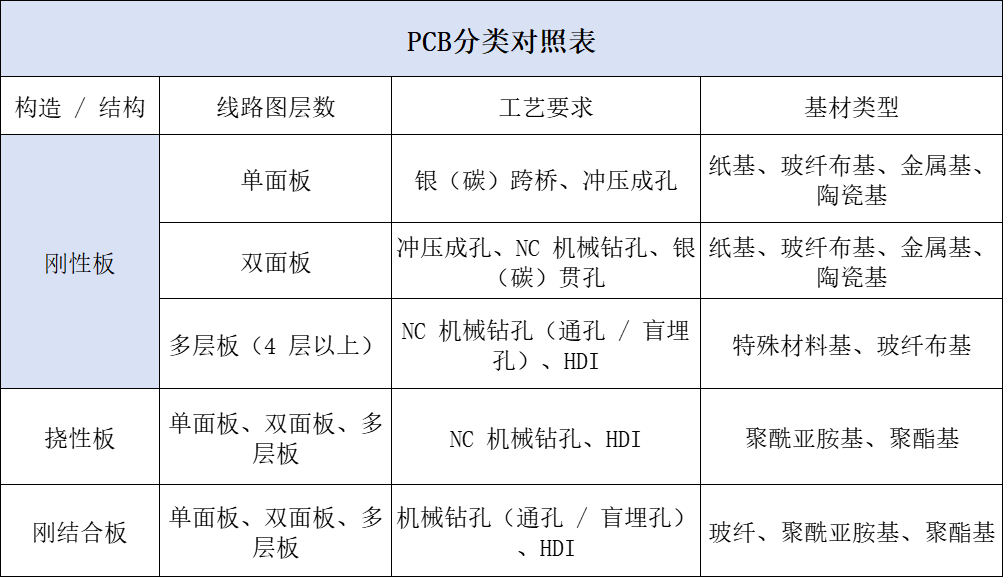 构造 / 结构、线路图层数、工艺要求、基材类型对照表: