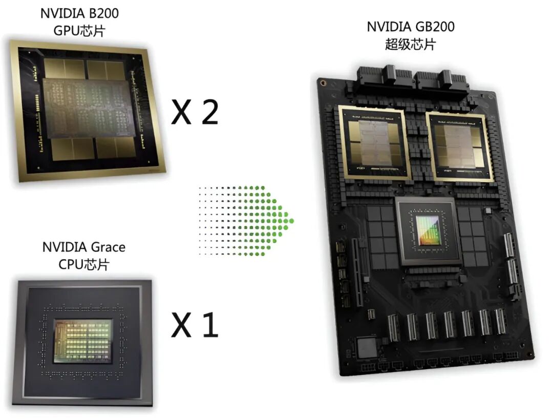 将两个B200 GPU与一个基于Arm的Grace CPU进行配对,再通过900GB/s的超低功耗NVLink连接在一起,可以组成GB200超级芯片。
