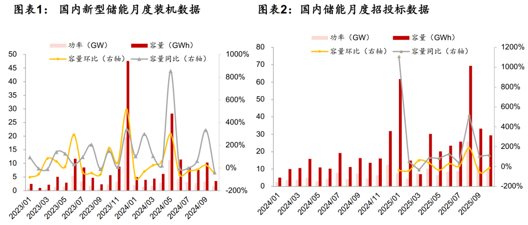 当前国内储能采招市场景气度维持高位,装机规模同步增长。据储能与电力市场公众号,2025年1-10月国内储能招标达101.6GW/315.5GWh,同比增长118%/156%。据CNESA统计,三季度新增装机9.16GW/25.52GWh,同比增加10%/24%。前三季度新增装机规模已达 2024年全年新增的 74%,考虑到第四季度前期招标项目进入集中安装阶段,预计全年装机规模有望超越2024年水平。