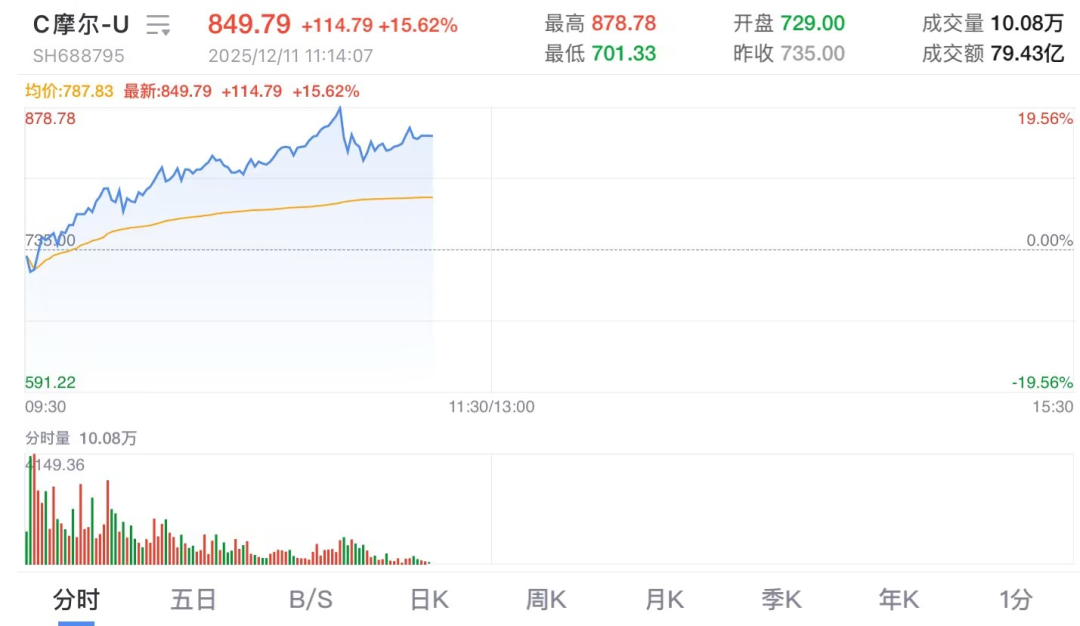 个股层面,摩尔线程早盘大幅拉升,涨幅超16%,股价报858元,总市值突破4000亿元。这使得其最新市值已超过北方华创,在A股芯片概念股中市值排名第四,仅次于中芯国际、寒武纪和海光信息。从股价来看,摩尔线程也位列A股第三,仅次于寒武纪和贵州茅台。