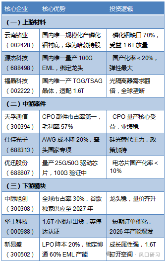 为中际旭创、新易盛供应光引擎等核心部件,客户全覆盖。CPO核心部件市占率领先,2024年毛利率57.2%、净利率41.3%,远超模块厂商。CPO从概念转量产,订单确定性强,防御属性突出。