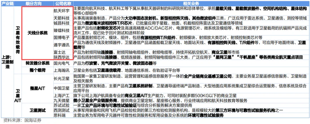 相关上市民营企业有航天环宇/天箭科技(星载天线)、铖昌科技/臻镭科技(芯片)、国博电子/通宇通讯(T/R组件)、富士达/陕西华达(连接器)、国光电气(行波管)、上海瀚讯(整个载荷)等;