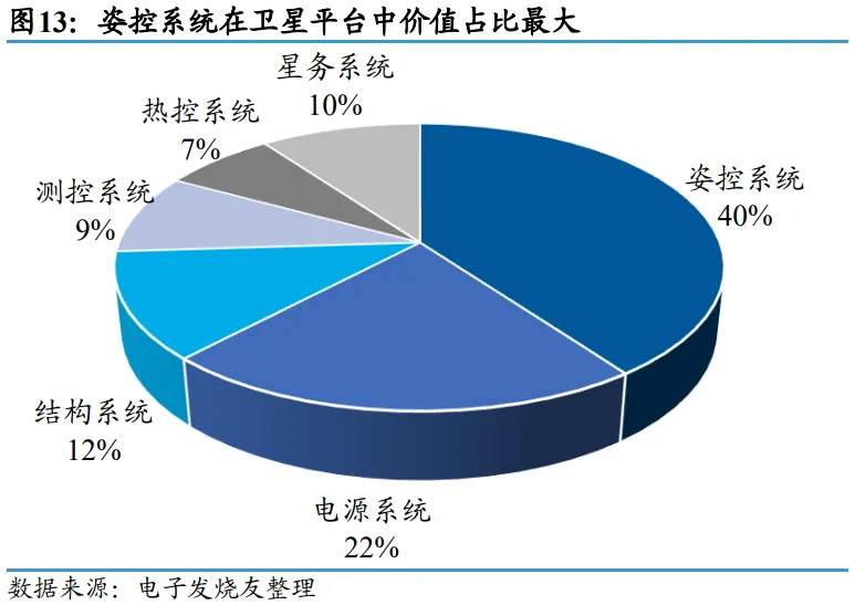 其中,姿态控制系统价值占比最高,约占卫星平台总成本的 40%,是平台中价值最大的分系统。