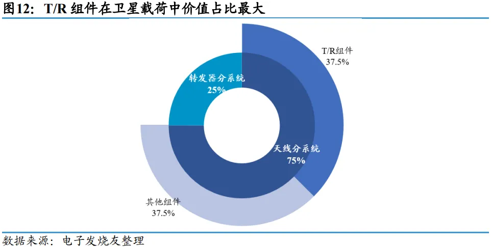 载荷主要分为天线分系统(价值占比 75%)与转发器分系统(价值占比 25%)。天线分系统主要用于实现空间中的电磁波信号与电缆中的电信号的转换,而转发器分系统负责接收、处理和重新发送通信信号。T/R 组件在天线分系统中价值占 50%,是整个卫星载荷中价值占比最高的核心零部件。