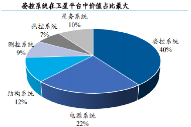 卫星平台是为有效载荷在轨正常工作提供支撑、保障和服务的所有分系统的集合。根据系统功能划分,卫星平台通常包含姿态控制、电源、结构、测控、热控与星务管理等分系统(返回式卫星另含着陆系统)。其中,姿态控制系统价值占比最高,约占卫星平台总成本的40%,是平台中价值最大的分系统。