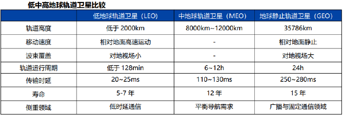 根据轨道高低,卫星可被分为高、中、低轨卫星。低空轨道卫星(LEO),指运行于距地球表面200-2000公里轨道的人造卫星,因其轨道低,信号传播时延较短,链路损耗较小,且对用户终端的要求较低,能够支持微型卫星与手持用户终端,适用于低延迟、高频次的全球通信需求。