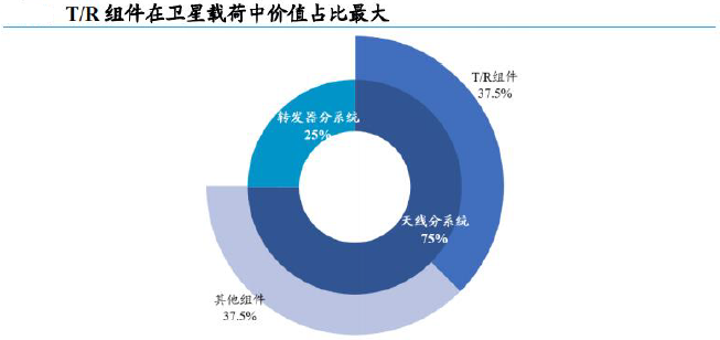 载荷主要分为两大子系统:天线(占价值75%)和转发器(占价值25%)。天线负责空间电磁波与馈电电缆电信号的互转;转发器完成信号的接收、处理与重发。在天线子系统中,T/R组件价值占比达50%,是整个载荷单价最高的核心器件。此外,载荷还涵盖星间链路等部分。