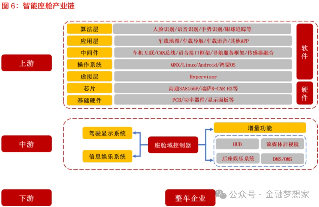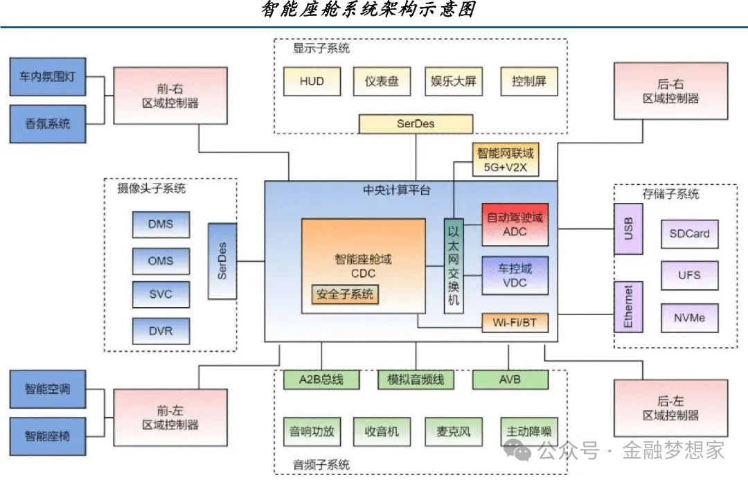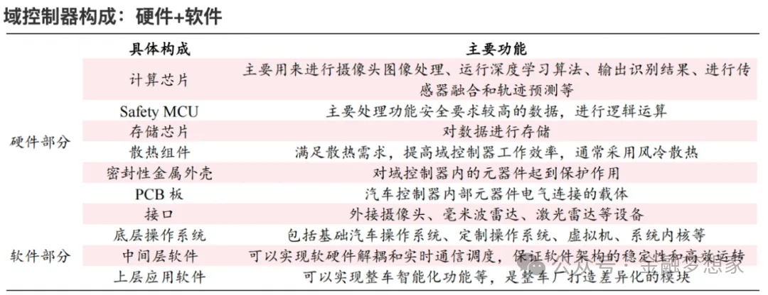 从汽车功能域划分来看,当前行业已形成动力总成域、底盘域、车身域、智能座舱域、自动驾驶域五大核心域架构,其中自动驾驶域承担着环境感知融合、高精定位、路径规划、决策控制、数据通讯等关键任务,需外接激光雷达、摄像头、毫米波雷达等多类型传感器,通过多源数据的实时处理与算法迭代,为车辆提供从辅助驾驶到完全自动驾驶的全场景能力支撑。(公众号:金融梦想家)其核心价值不仅在于简化整车线束布局、降低硬件冗余成本,更在于通过 “软件定义汽车” 的模式,实现智驾功能的 OTA 持续升级,成为整车产品力差异化竞争的核心抓手。
