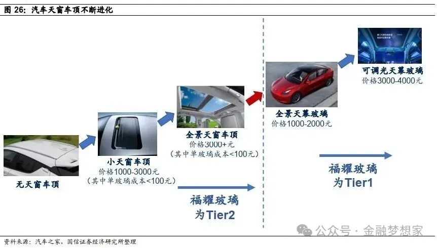 价值量:基础天幕玻璃单车价值约 900 元,镀膜隔热版本提升至 1500 元左右,集成调光功能后跃升至 3000-10000 元(EC 方案普遍 3000-6000 元,高端定制化方案超 10000 元),显示级天幕未来价值量有望突破 2 万元,较传统天窗提升 15-20 倍;