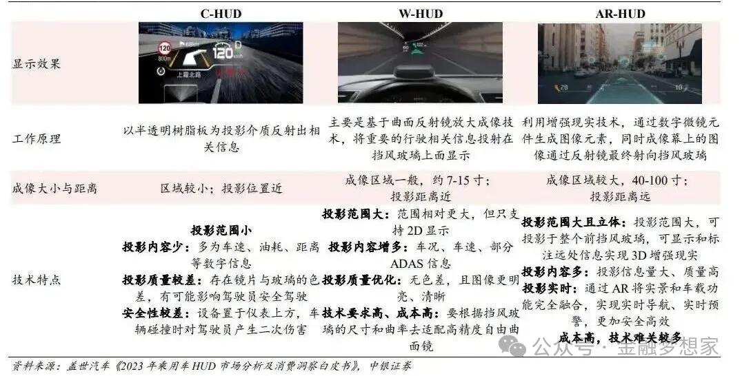 目前汽车行业HUD主要有3种产品形态,分别是C-HDU、W-HDU及AR-HUD。