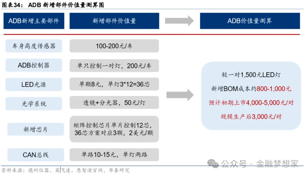 增量:ADB相较于LED大灯的增量部件主要在于ADB控制器、矩阵控制芯片、LED光源。装车成本在主机厂接受范围内,预计ADB车灯规模生产后稳态价格可降至3,000元/对。(公众号:金融梦想家)
