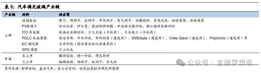福耀玻璃(国内市占率超 40%,覆盖基础镀膜至 EC 调光全系列产品,配套比亚迪、蔚来、理想)