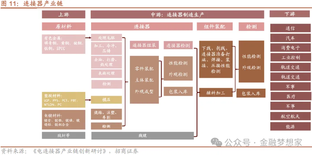 连接器位于产业链的中上游。上游为金属、电镀液、塑胶等原材料;中游为连接器和线缆制造商,进行连接器的设计、组装和制造;下游为汽车、通信等行业的应用厂商。