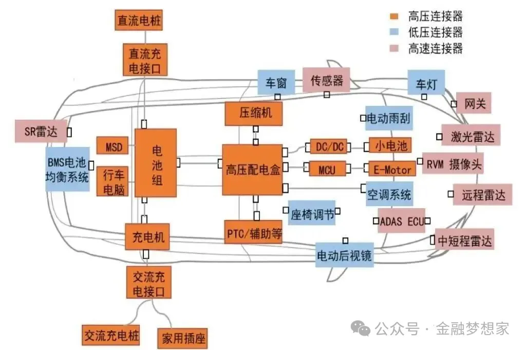 汽车高速连接器是承载车内高频、大容量数据传输的核心电子元器件,与高压连接器共同构成新能源汽车的 “神经 - 血管” 系统 —— 高压连接器对应电动化的 “动脉血管”,高速连接器则是智能化的 “神经网络”,(公众号:金融梦想家)专门解决传感器、域控制器、车联网模块等设备间的低延时、高可靠数据交互需求。