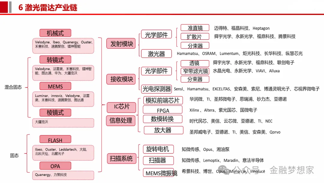 激光雷达光电系统的成本约占激光雷达整机成本约70%,由激光发射模组、激光接收模组、测时模组(TDC/ADC)、控制>模组四部分构成,(公众号:金融梦想家)其中收发系统占比约60%,是激光雷达最核心的部件。