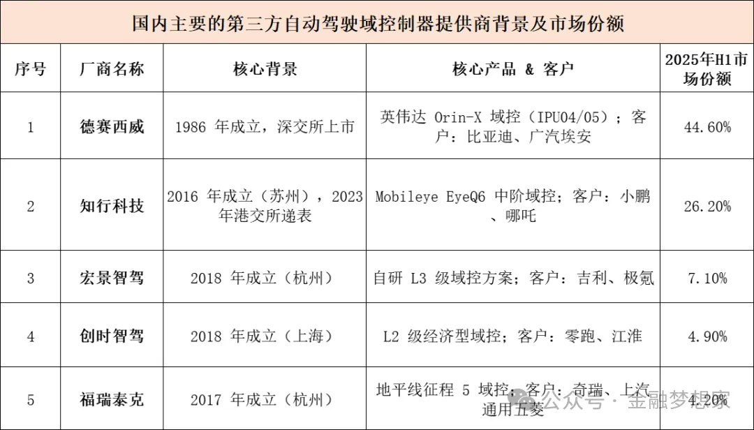 经纬恒润(市占率约 15%,域控硬件集成与软件适配能力突出,配套华为智驾方案)
