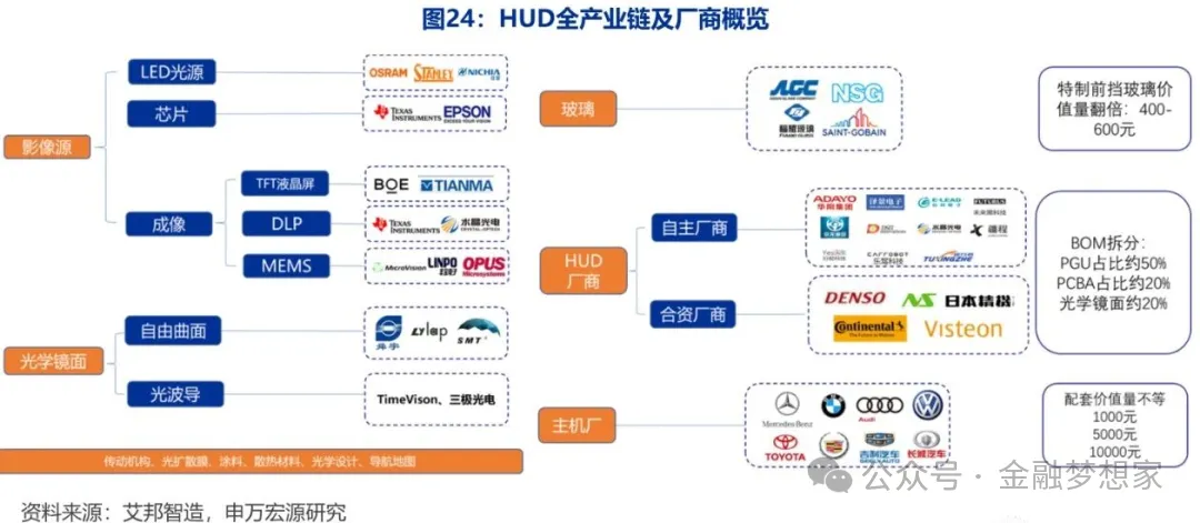 HUD产业链:主要构成为影像源(价值量占比50%,核心部件)、光学镜面(价值量20%)、PCB板等电子器件(价值量20%)、玻璃、等多项部件构成,涵盖电子、光学、软件等多类型厂商。
