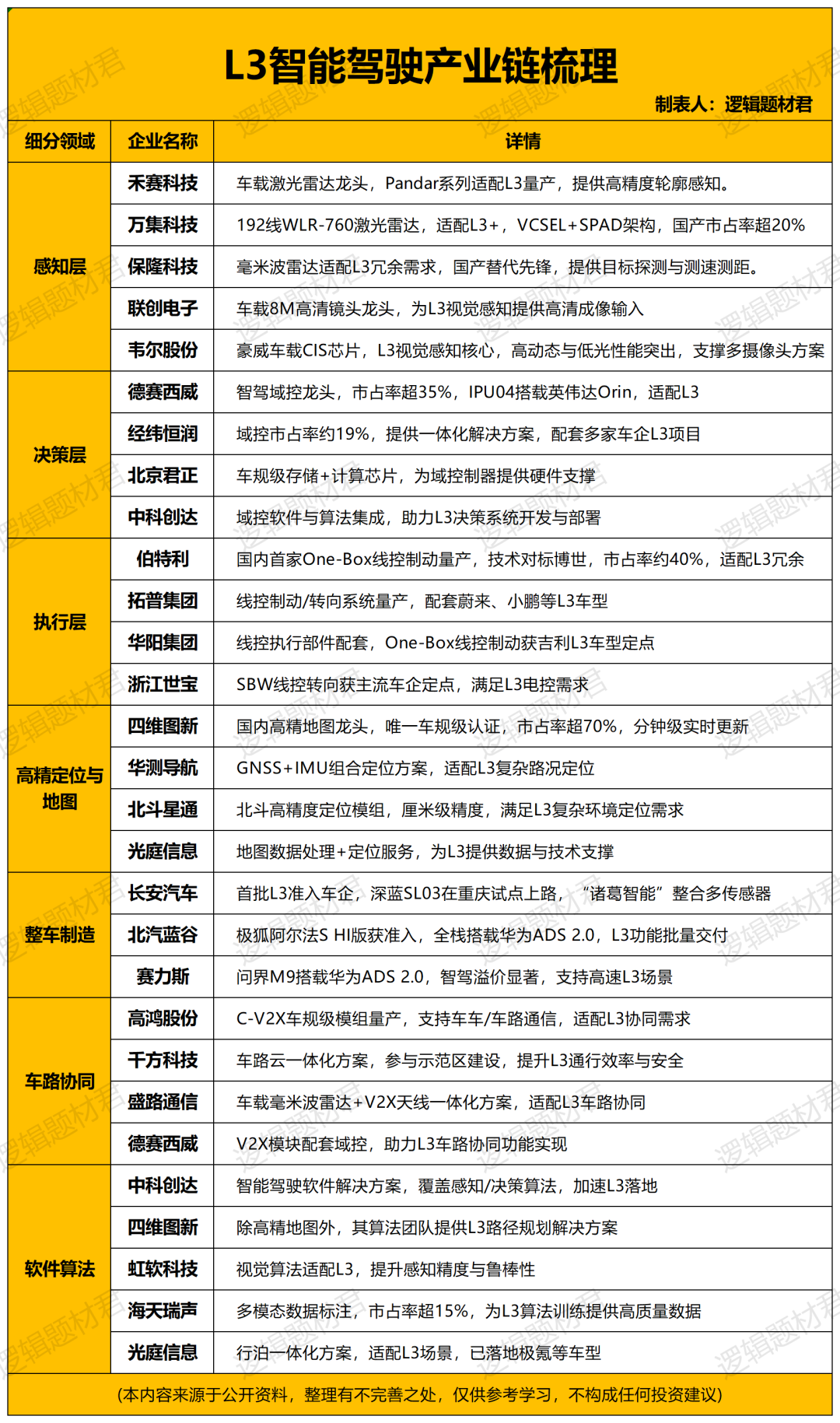 接下来,逻辑君围绕感知-决策-执行-整车四大核心环节,筛选出10家兼具技术壁垒与量产能力的企业,它们既是产业链的核心支撑者,也是商业化红利的直接受益者。