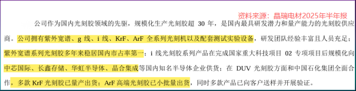 而且公司 2020 年就启动了光刻胶研发项目,目标是打通 KrF、ArF 光刻胶用树脂的合成路线,现在已经完成了 ArF 光刻胶的小批量出货,KrF 光刻胶也实现了量产,给多家客户供货了。