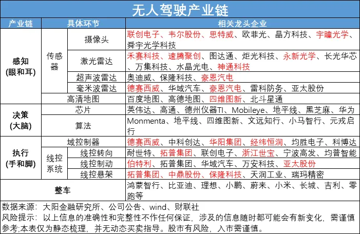 周末我们也基本把智能驾驶一些核心环节与公司梳理出来了。短期受益确定性较高的可能还是卖铲子的零部件,L2升级到L3,核心增量聚焦在激光雷达、域控制器、线控底盘等环节。