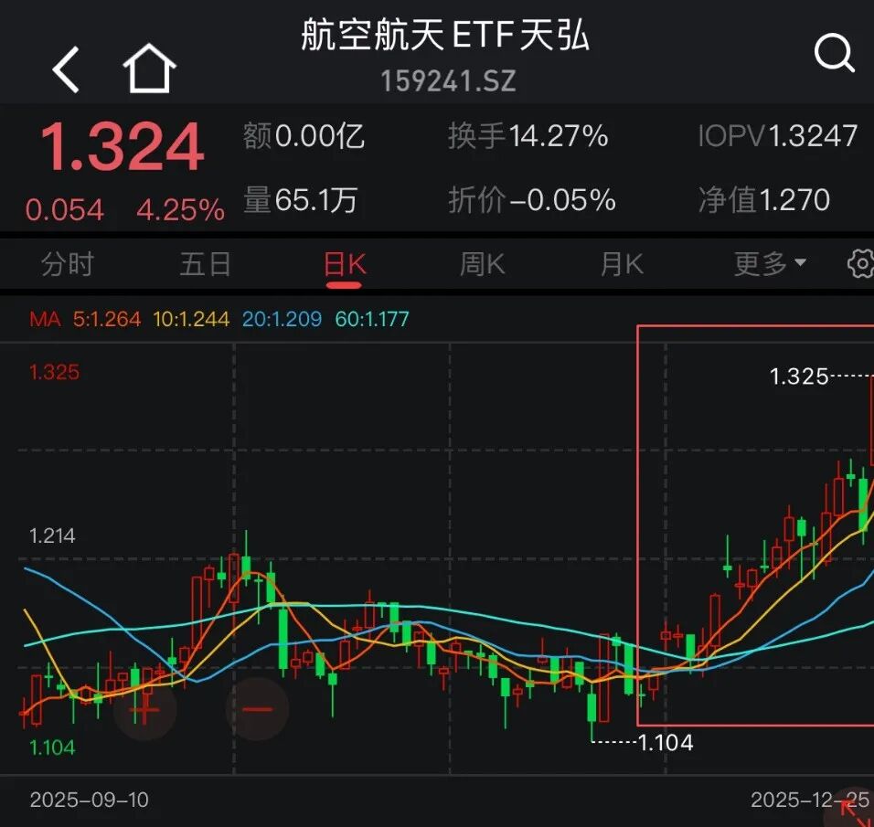 商业航天的看涨逻辑咱们是从一个月(11月26日)前就在聊(市场有些大的变化),当时提到的航空航天ETF天弘(159241)正好就处在这轮上行期(下图红框)的起点,这一个月跟踪的标的指数涨了超过16%,今天大涨了4个多点。