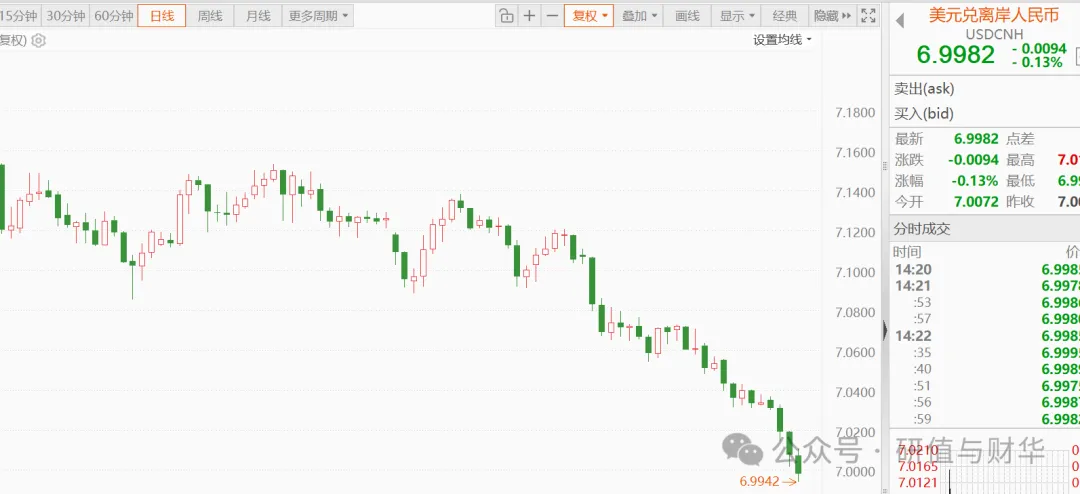 3. 8月-年末(温和升值冲刺期):中美经贸关系缓和、美联储9月起开启降息周期,叠加外资持续增持人民币债券,人民币在7.10-7.05区间平稳波动;12月中旬后加速升值,升破7.05关口,12月24日离岸人民币最低触及7.0032,在岸人民币下探至7.0133。