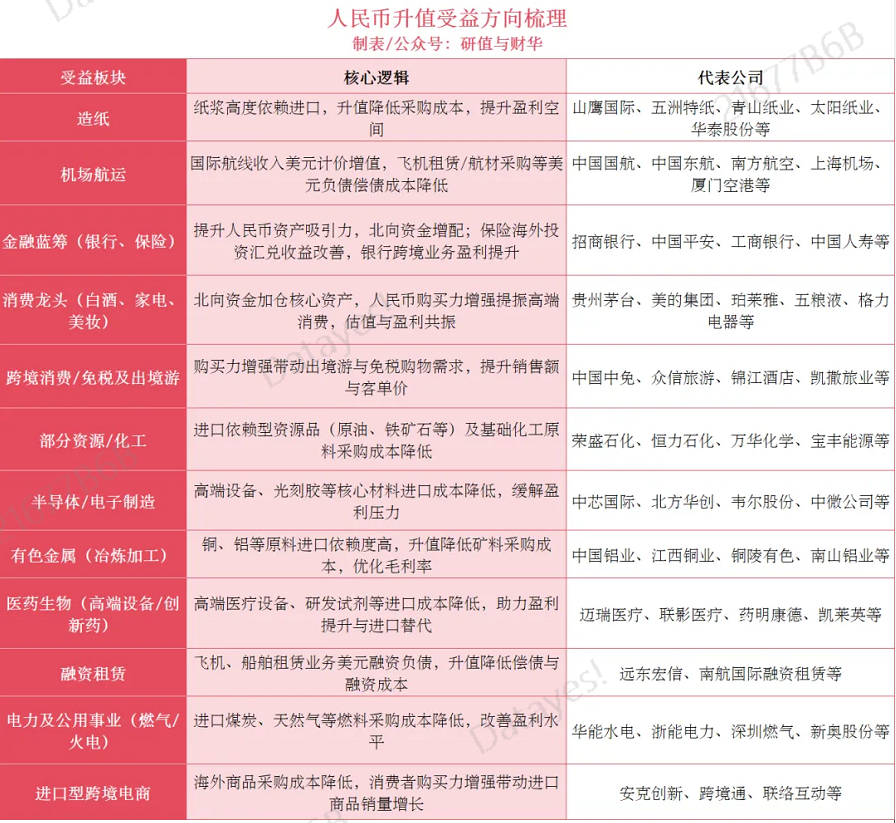 人民币升值通过成本端减负、资金端流动传导至资本市场,核心受益方向及板块如下: